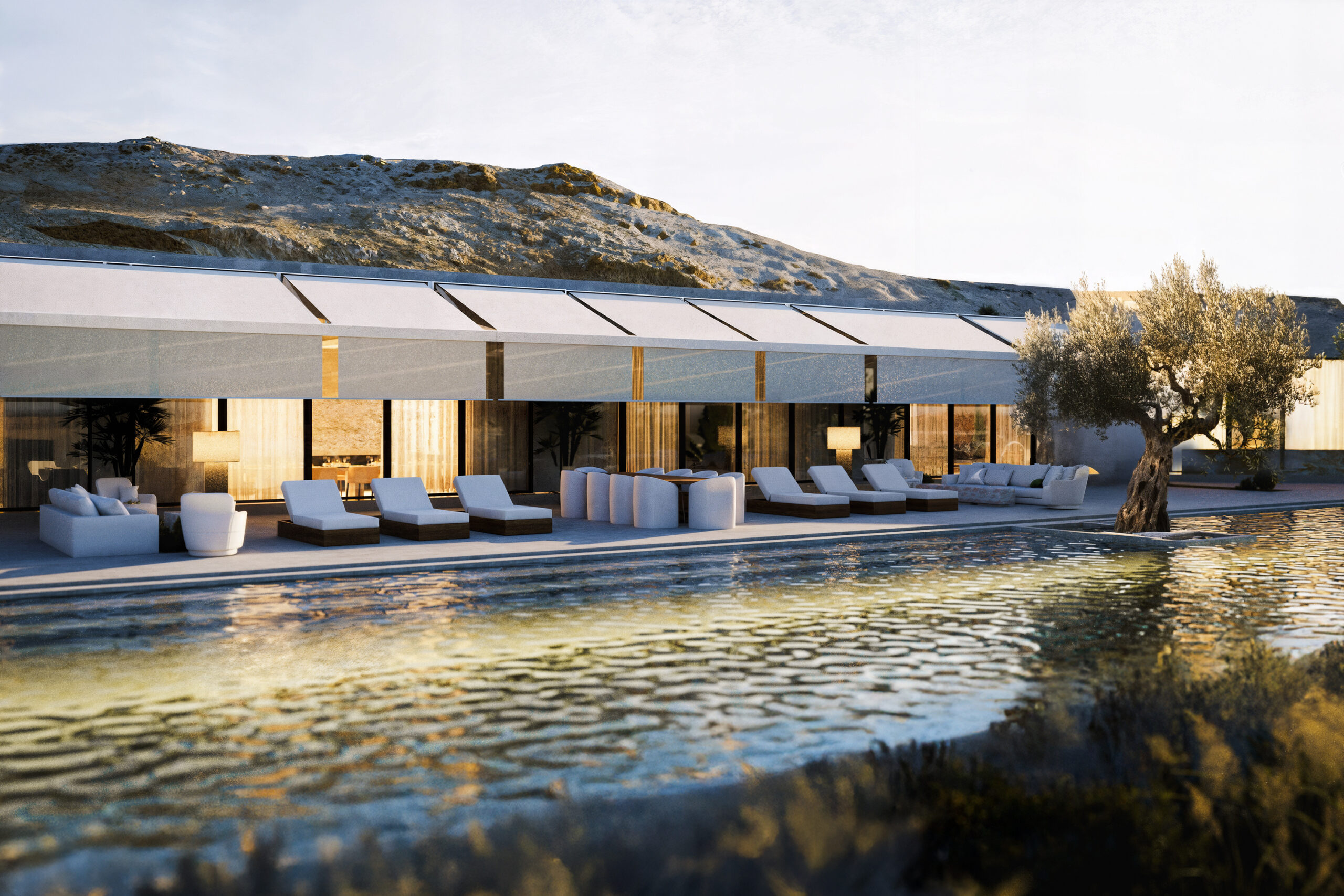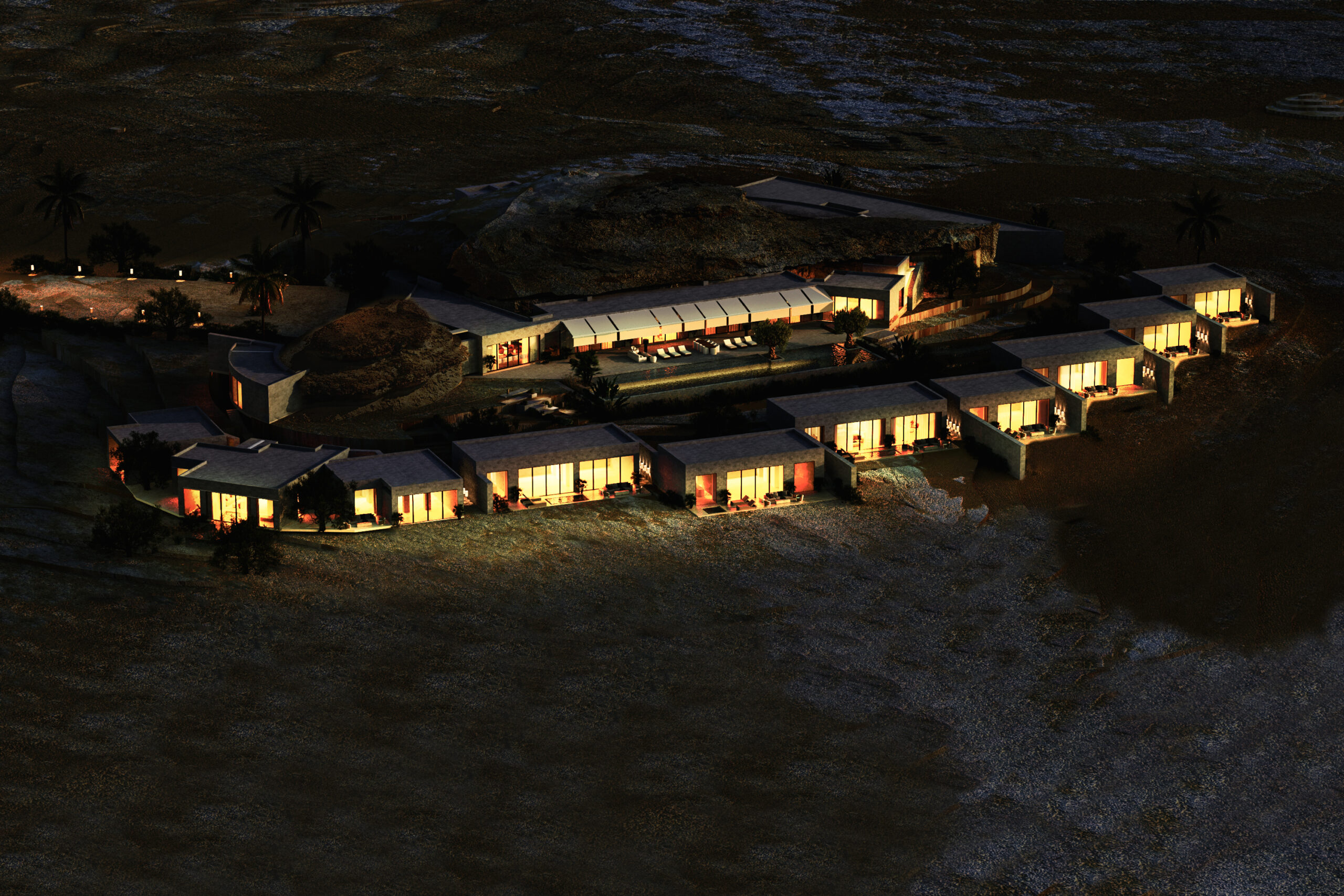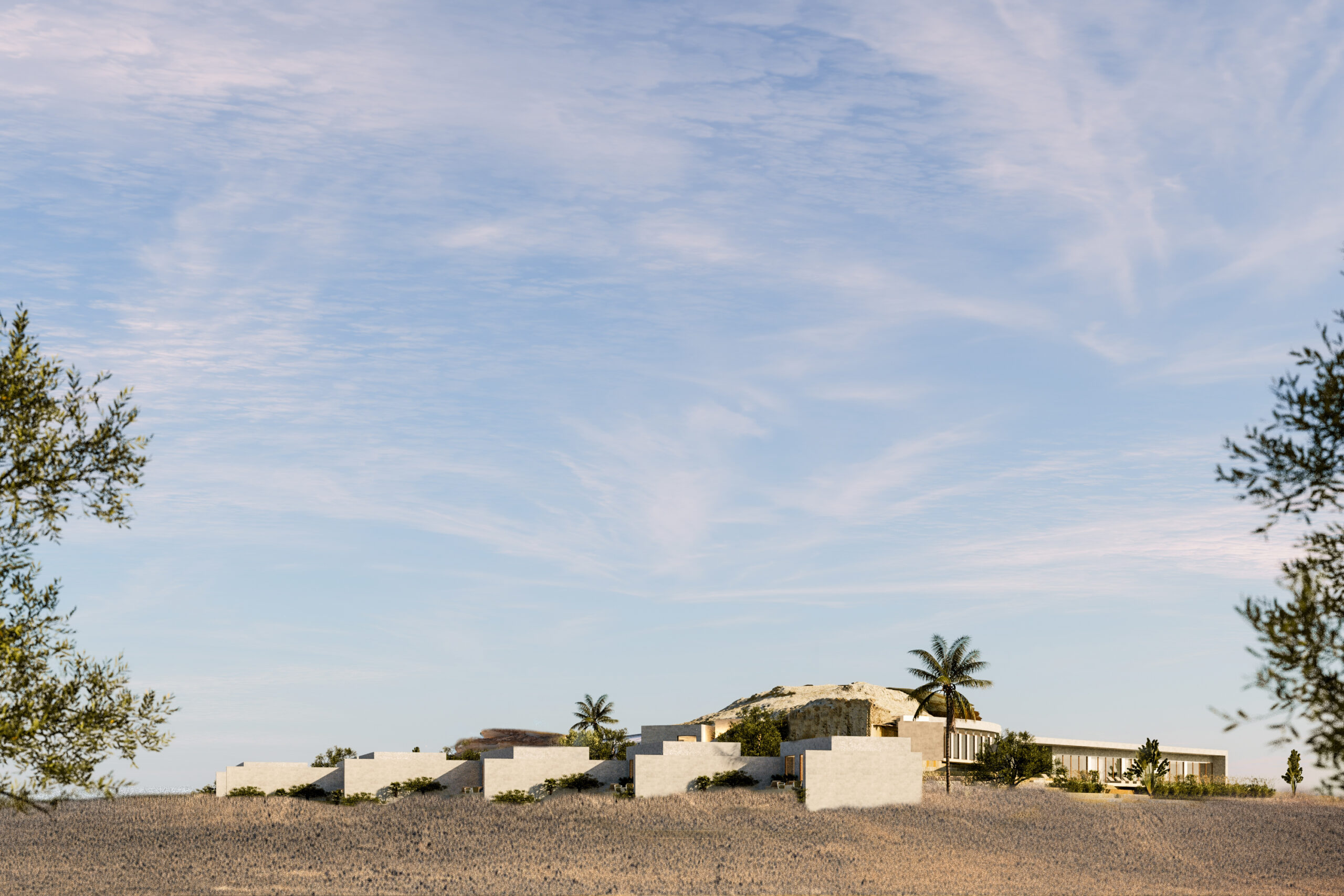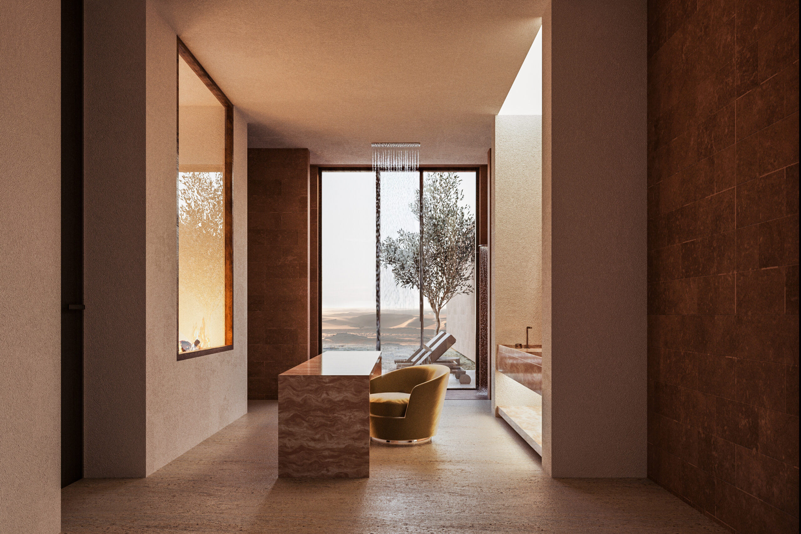 The property’s design creates spaces that mediate between the three scales of the desert. An oasis, carved as an offset between two rock hills, serves as a threshold between the intimate and macro scales, while integrating the micro scale of textures and erosion patterns. These spaces respond to natural forces and dramatic views, shaping varied spatial experience.