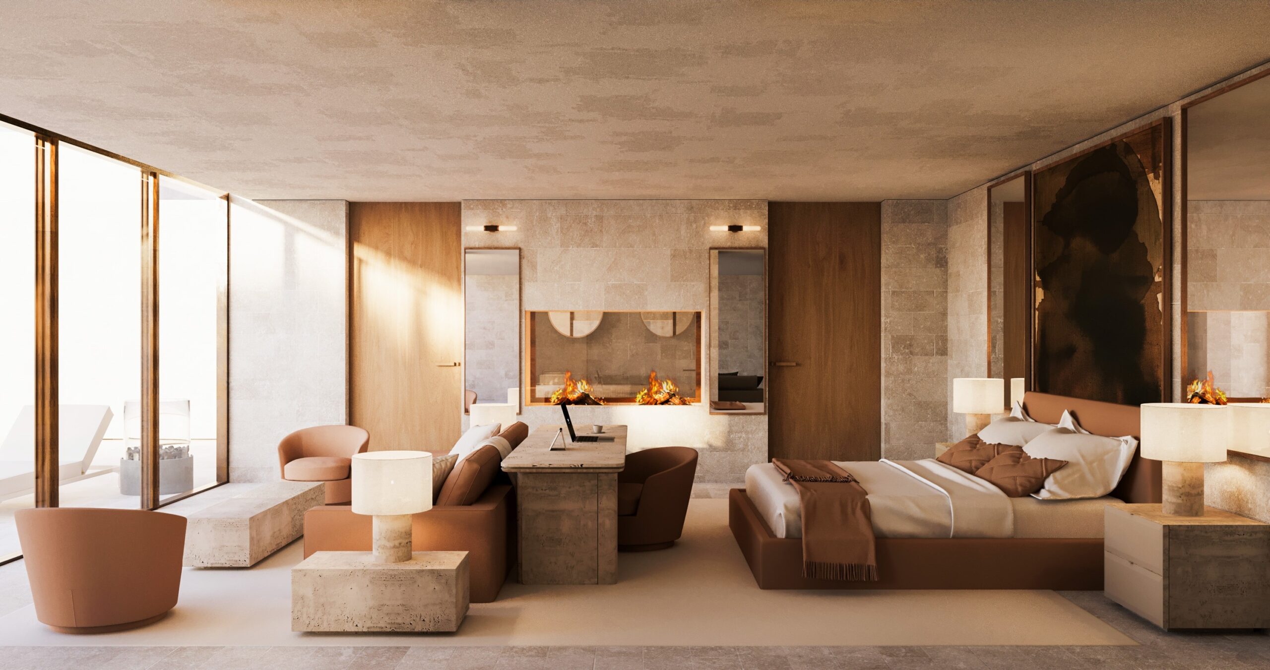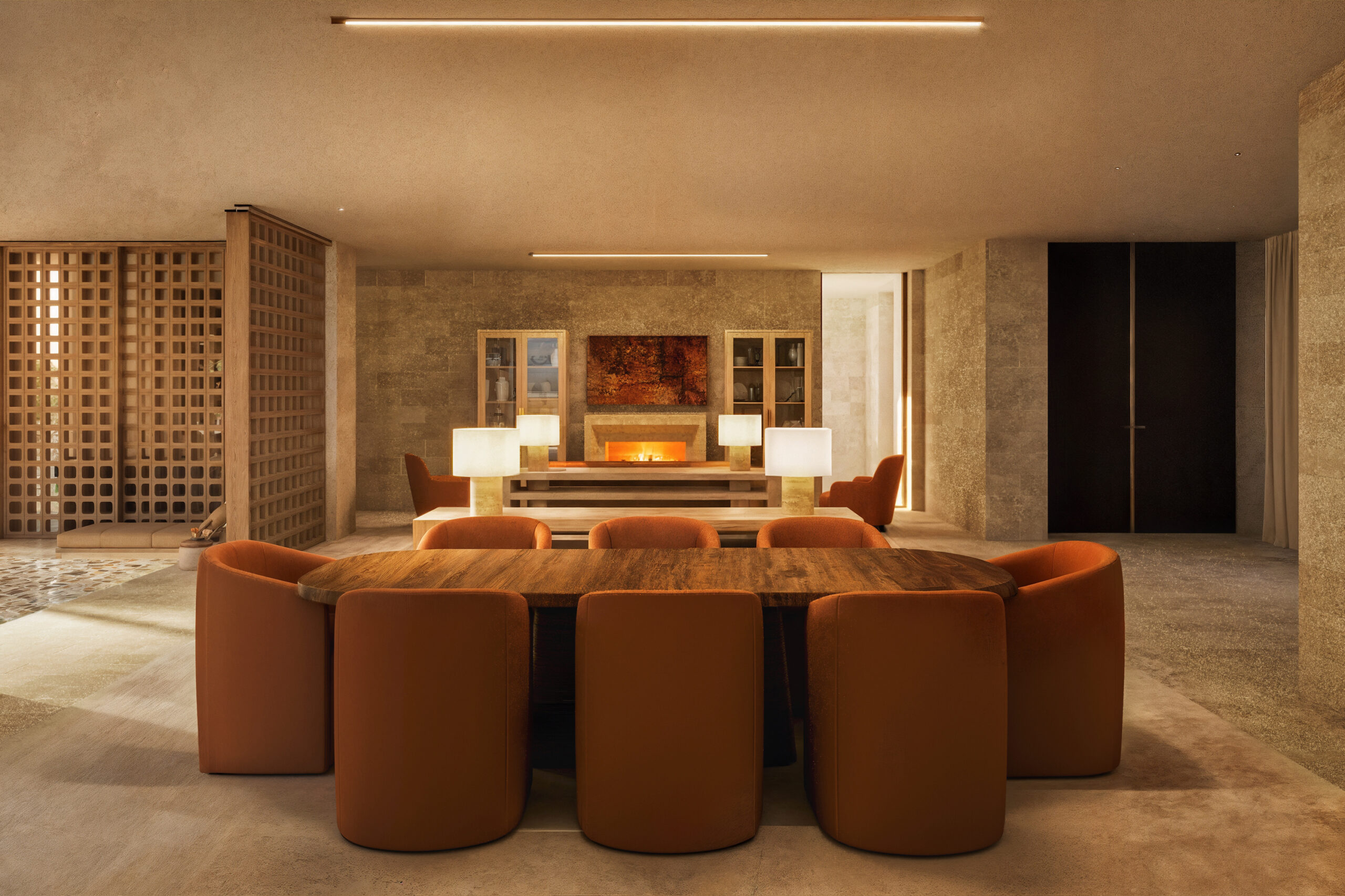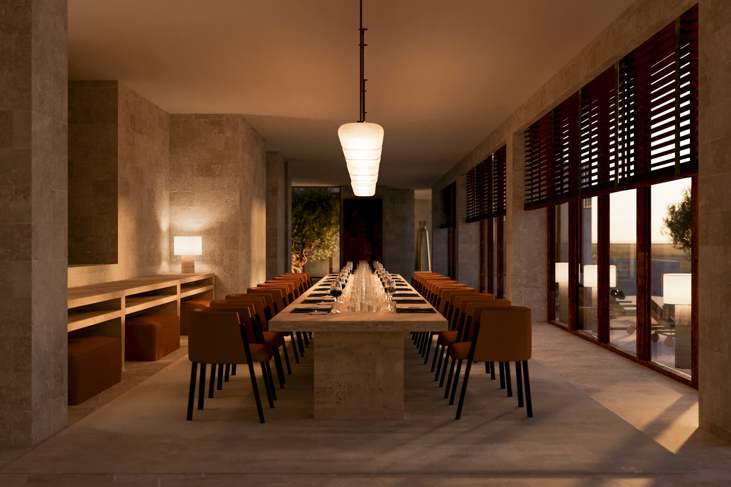 The property’s design creates spaces that mediate between the three scales of the desert. An oasis, carved as an offset between two rock hills, serves as a threshold between the intimate and macro scales, while integrating the micro scale of textures and erosion patterns. These spaces respond to natural forces and dramatic views, shaping varied spatial experience.