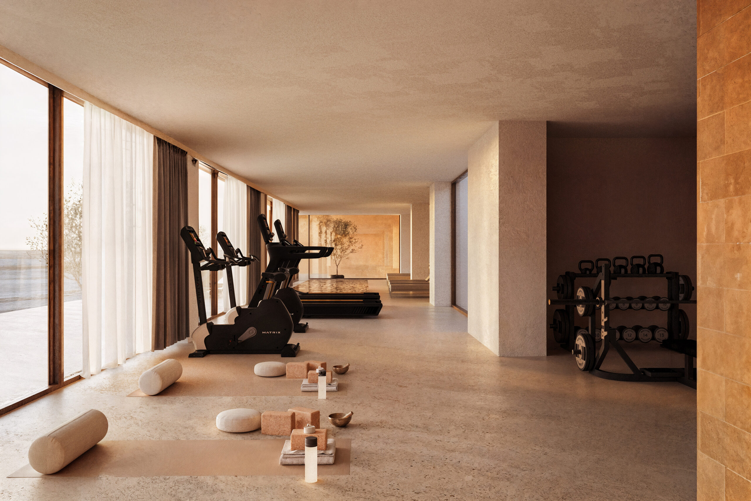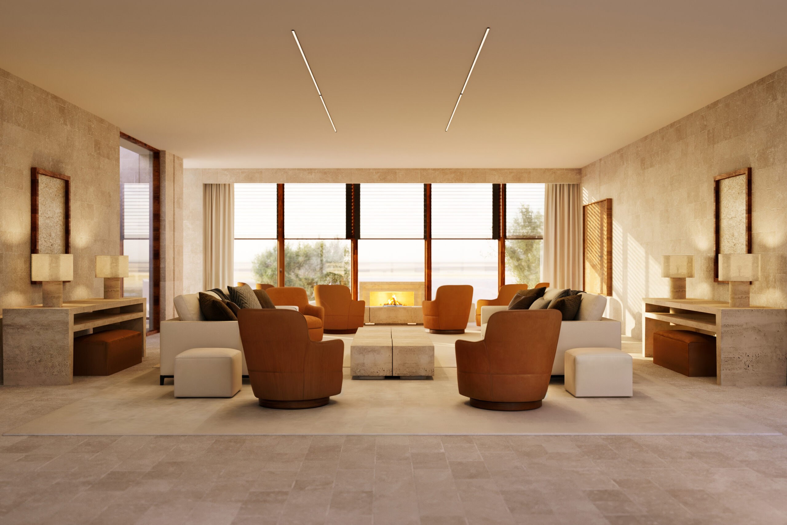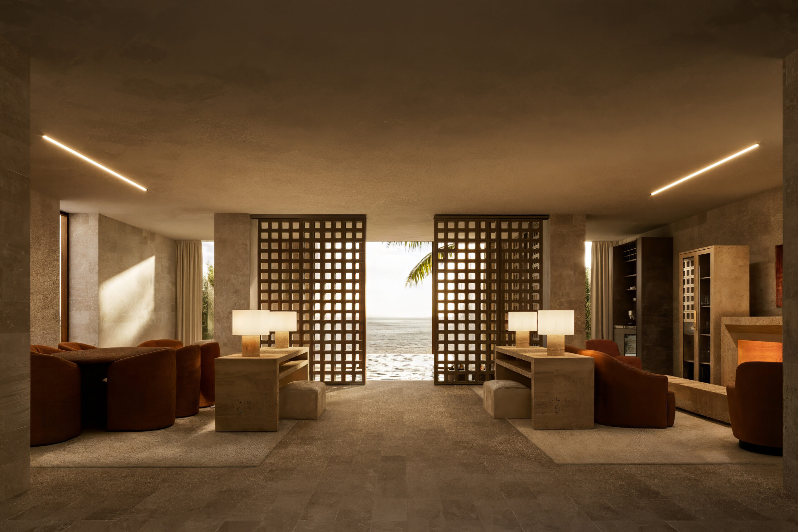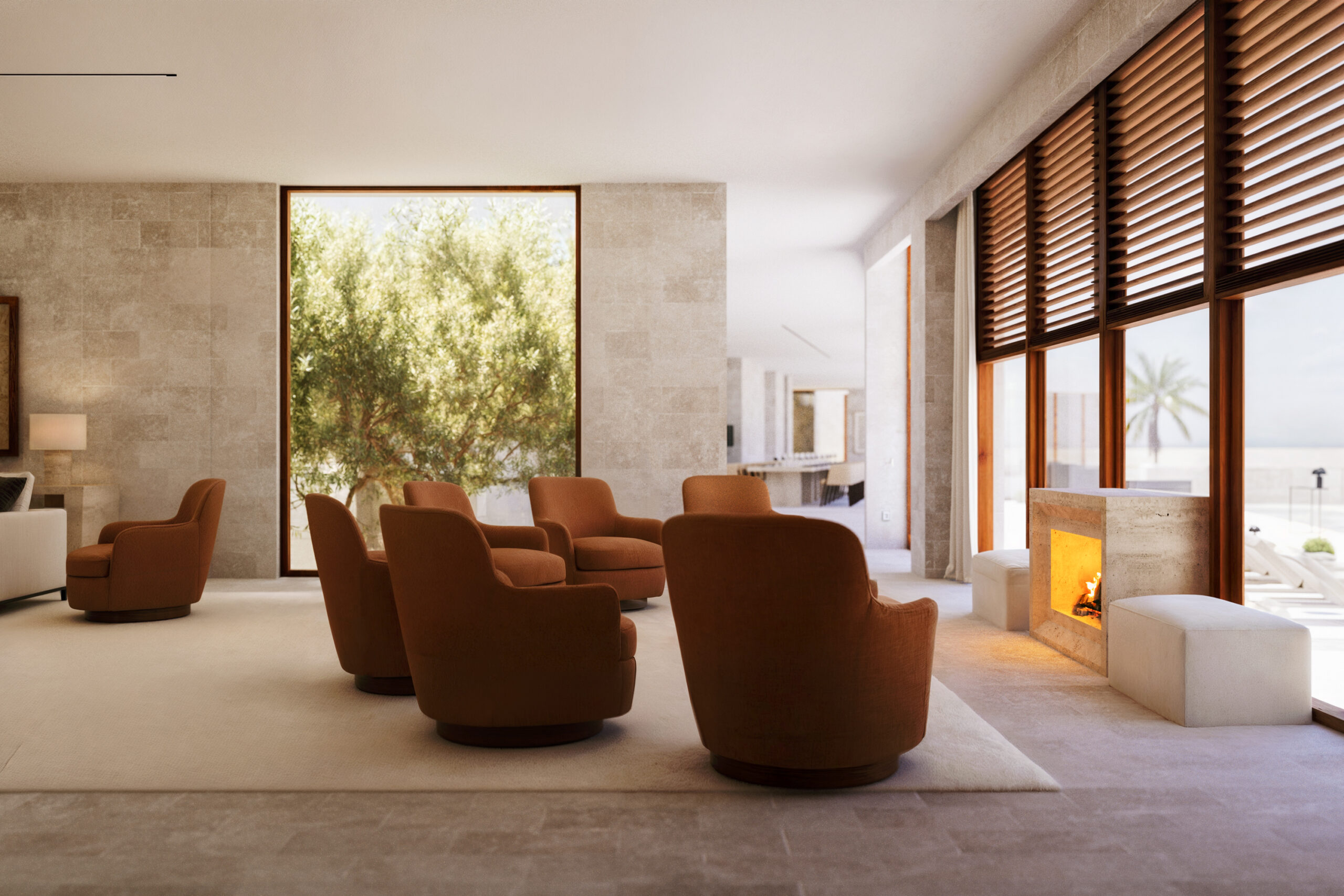 The property’s design creates spaces that mediate between the three scales of the desert. An oasis, carved as an offset between two rock hills, serves as a threshold between the intimate and macro scales, while integrating the micro scale of textures and erosion patterns. These spaces respond to natural forces and dramatic views, shaping varied spatial experience.