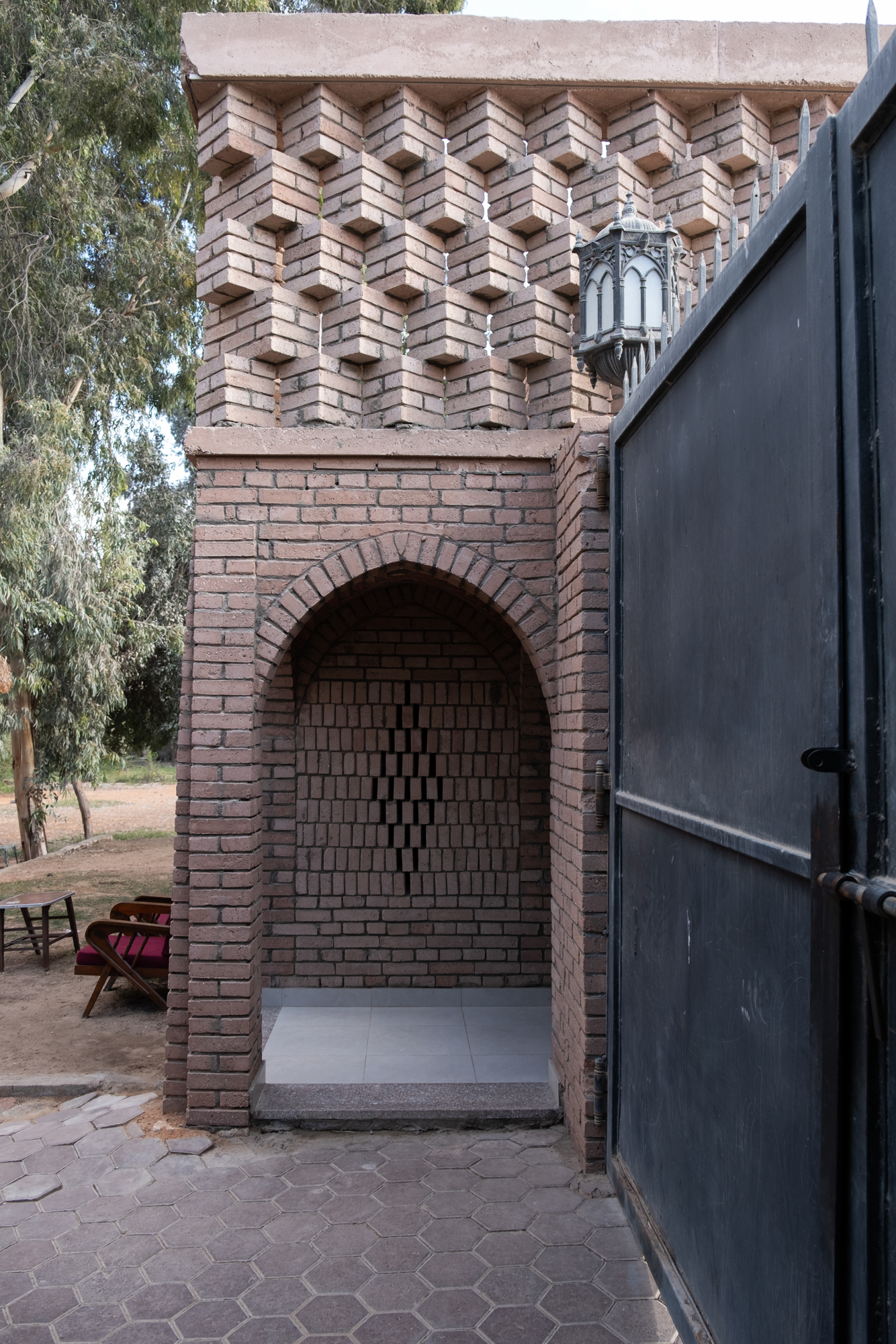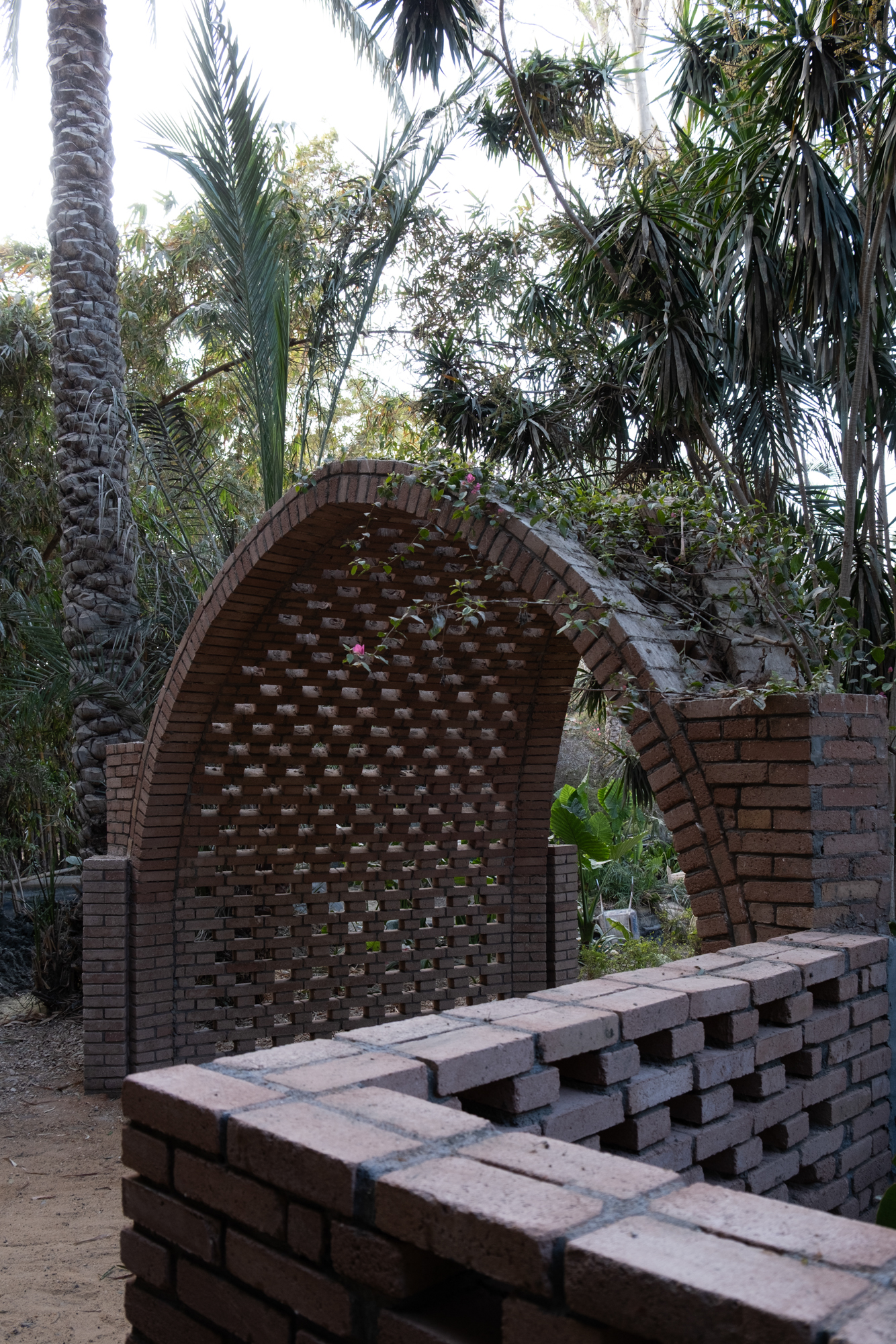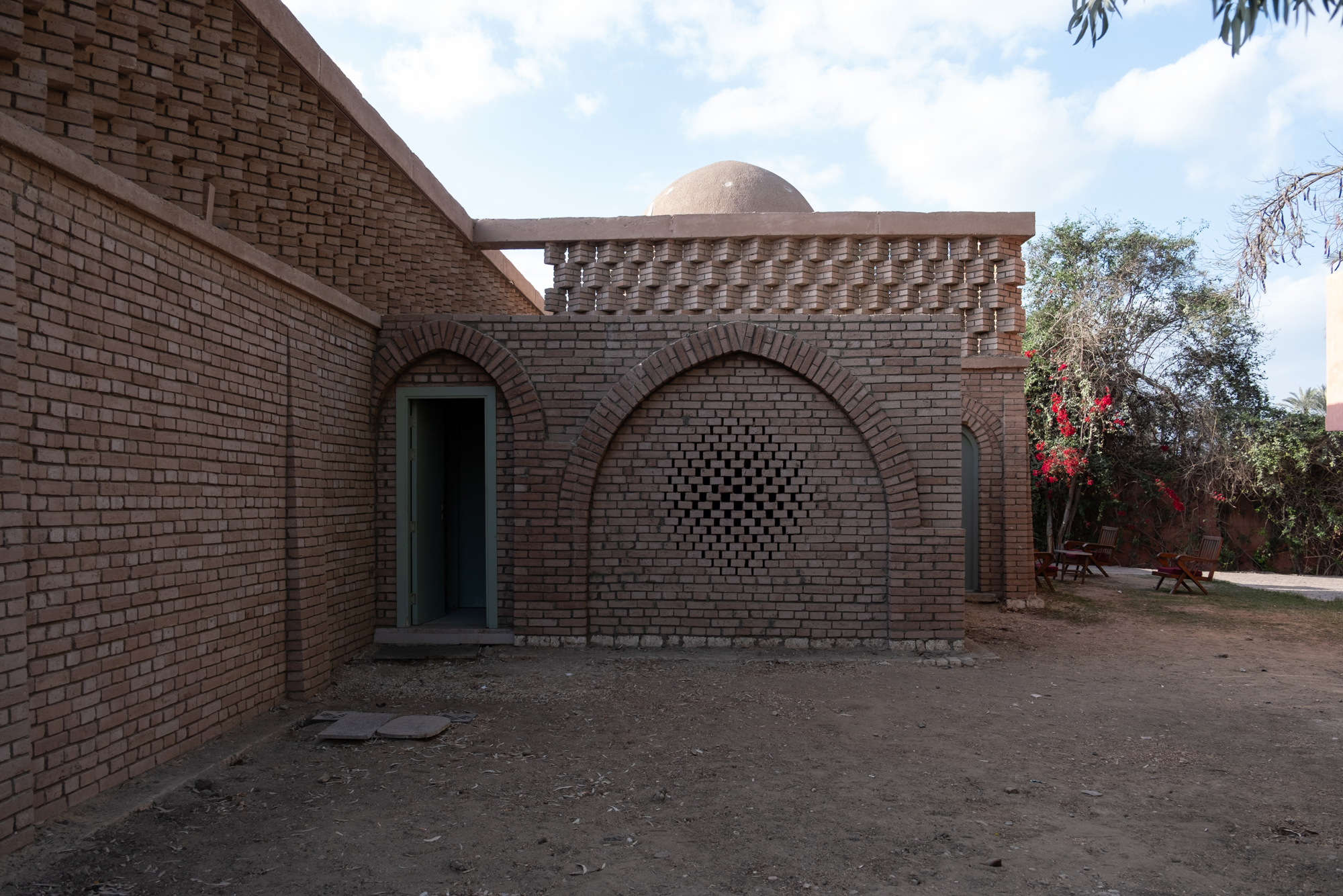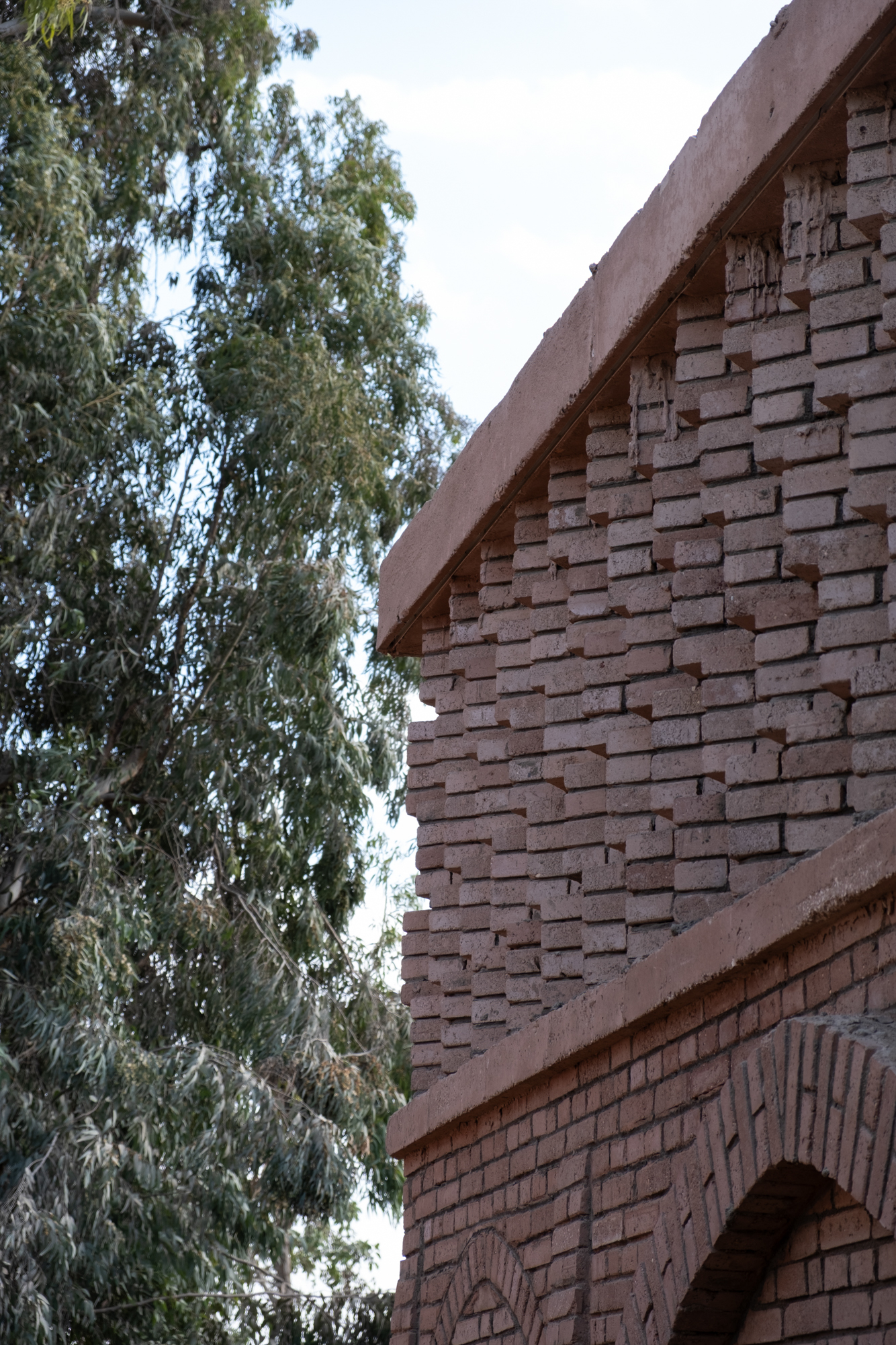 The Mansoureya Fence and Guard Room project explores brick craftsmanship, using Metropolymer bricks, locally upcycled bricks made from surplus materials from construction sites and factories. The Mansoureya Fence and Guard Room is a design-and-build project that initiated a series of works using the same material.